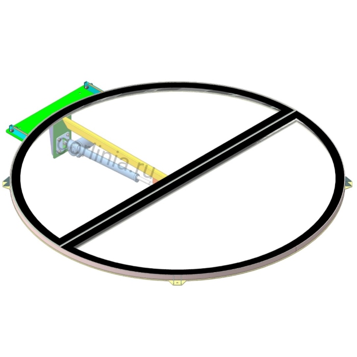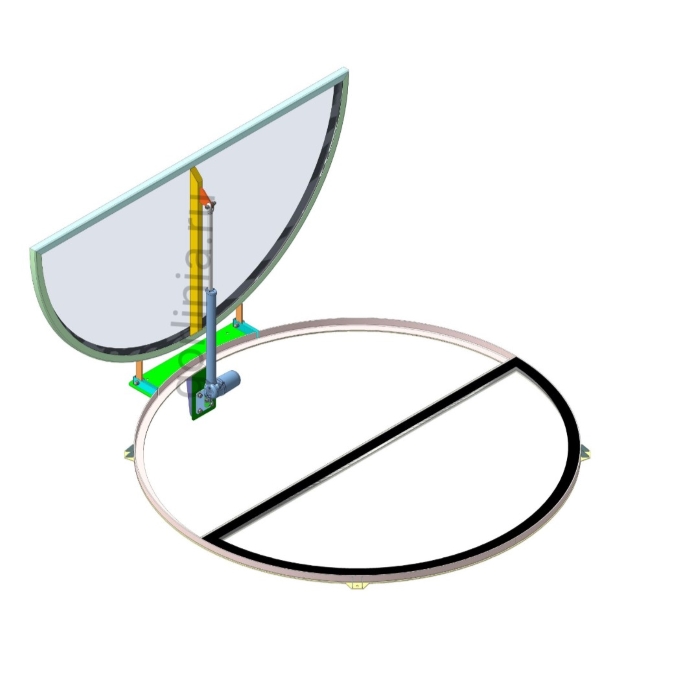 Редуктор подъемника крепится к вертикальной ответной части рамного основания горловины, шток - к импосту стеклопакета. Электропривод европейской сборки работает бесшумно (поверьте, нам есть с чем сравнить), длина базы и мощность усилия подобраны под массогабаритные характеристики светопрозрачной полукруглой створки.