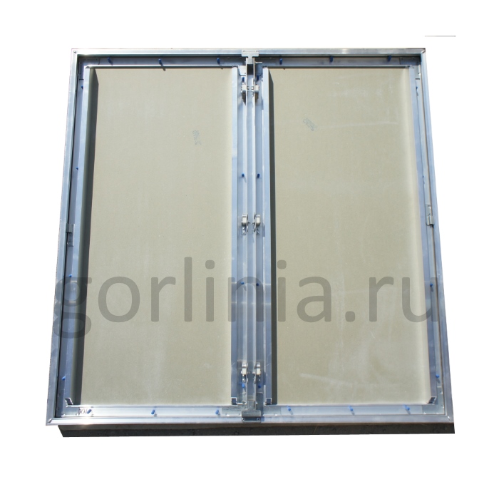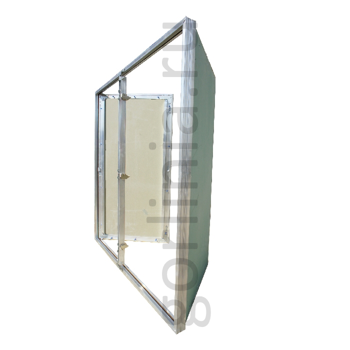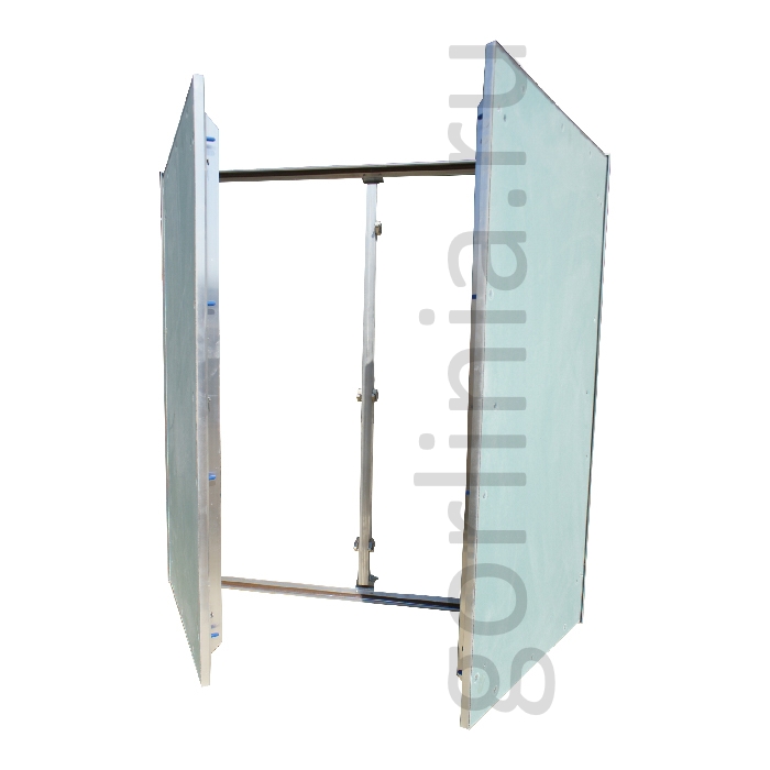 Нажимная дверца ходит на несъемных петлях с одной осью вращения, дополнительно фиксируется в коробке через съемную перемычку по центру. На больших створках в каркас закладываются элементы дополнительной обвязки.