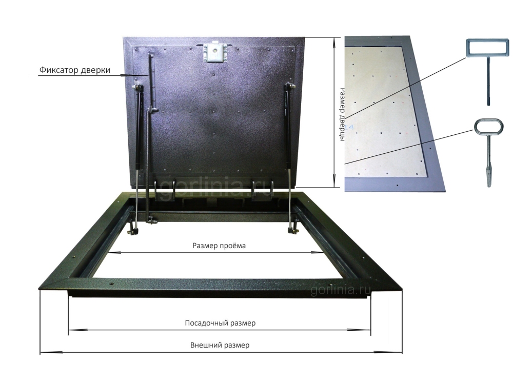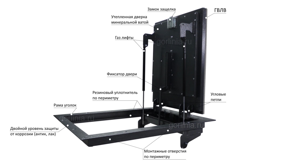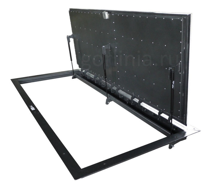 Створка в сэндвиче из стального листа обшита плитой ГВЛВ в уровень с наличником, все элементы фурнитуры (замок, газлифты, шарниры) скрыты внутри: верхняя лицевая часть подготовлена под финишной отделку керамогранитом, кварцвинилом или доской ламината с отступами и зазорами по схеме завода-изготовителя.