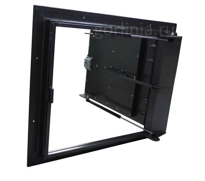 Каркас дверки из профиля 40х25 в обвязке лежит на опорной трубе 15х15 по трем сторонам и на шарнирах по петлевой. Уплотнитель проложен по четырем сторонам. Снизу ось открывания закрыта коробом для герметизации примыкания.